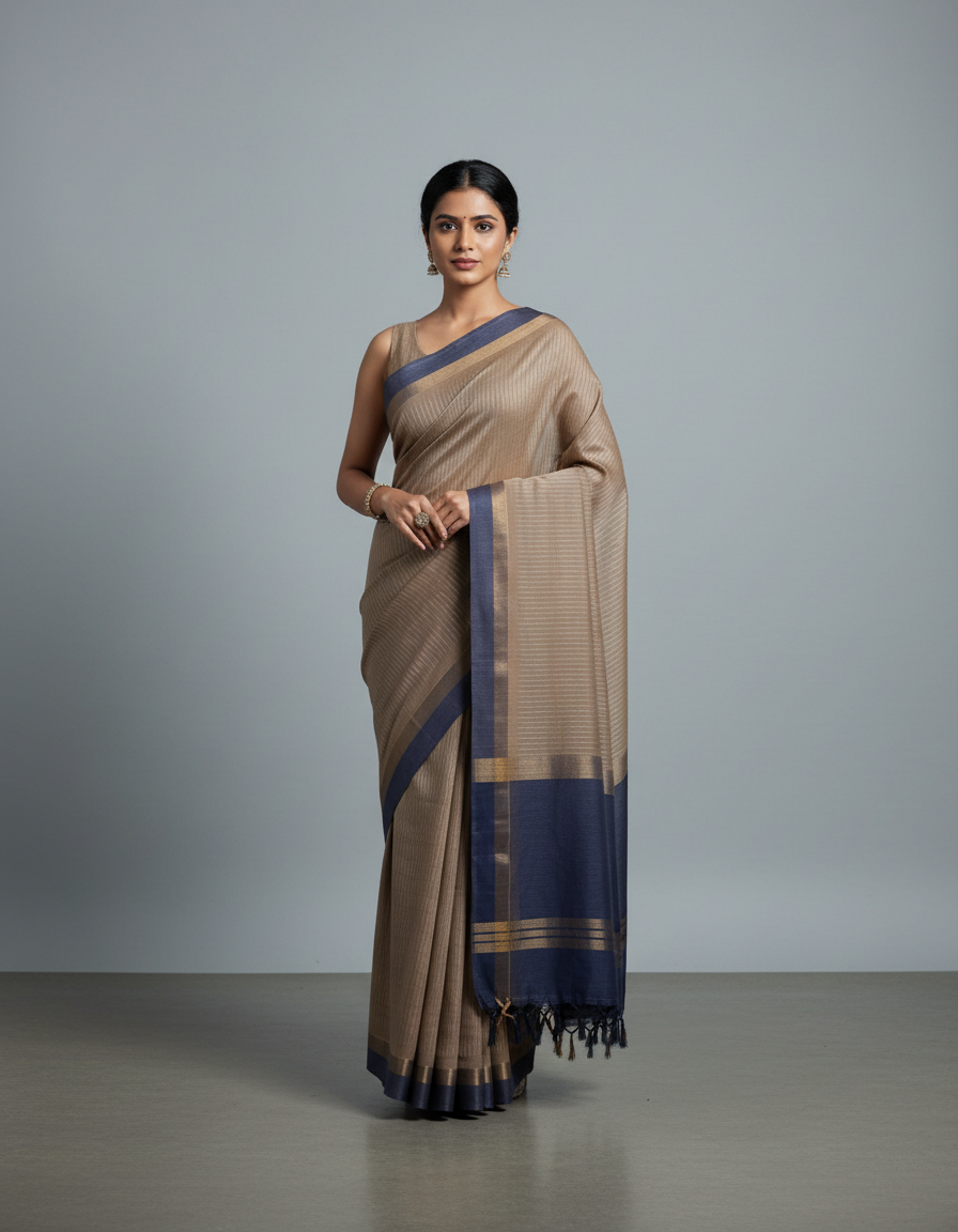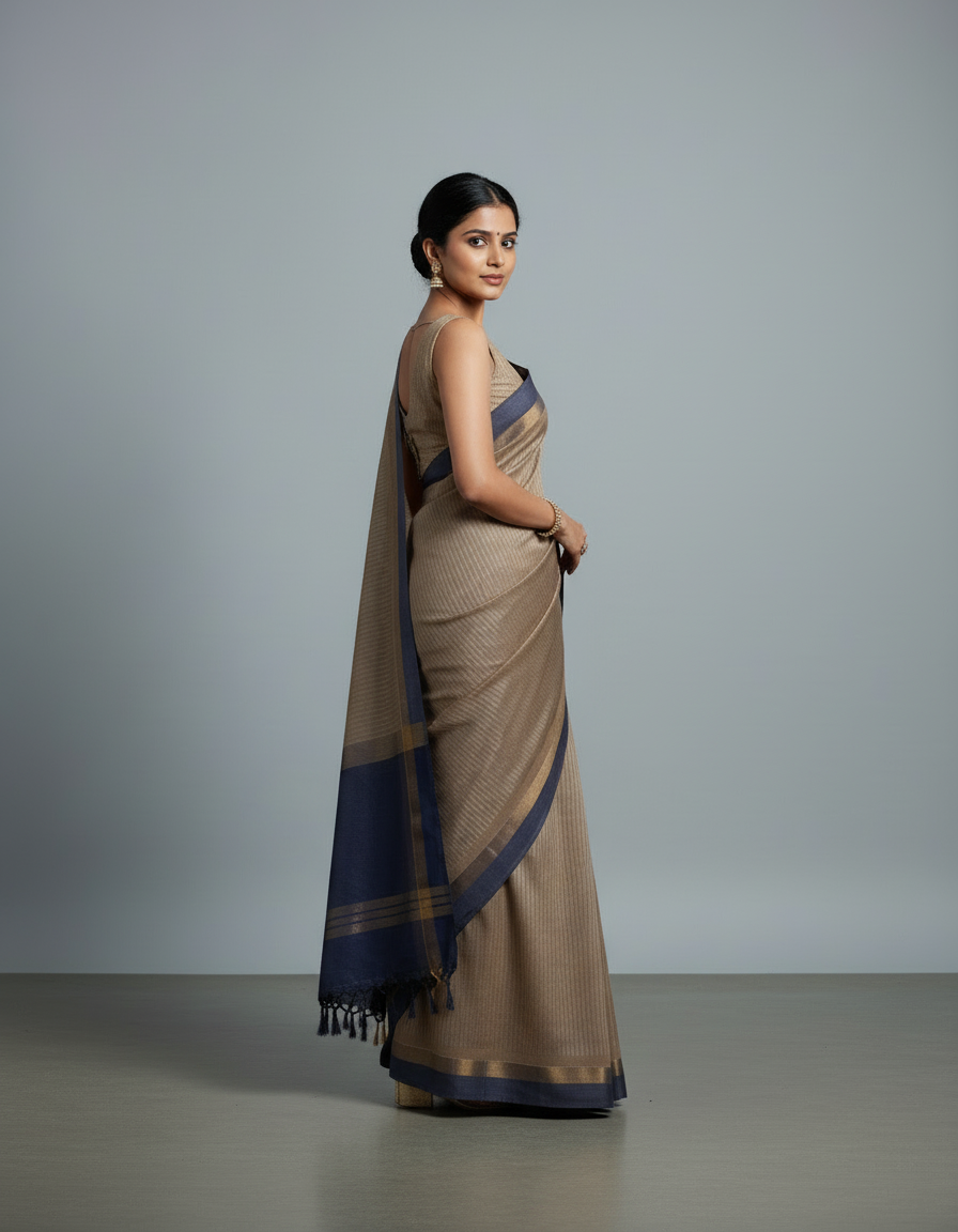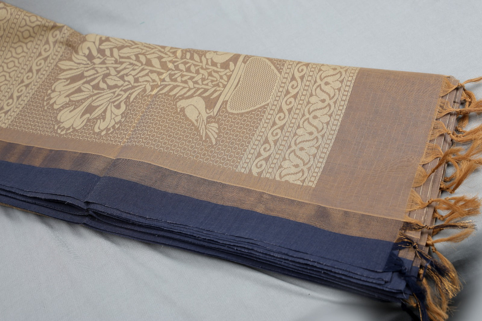 Elegant Light Brown Pure Cotton Saree with Navy Border – TREXORA