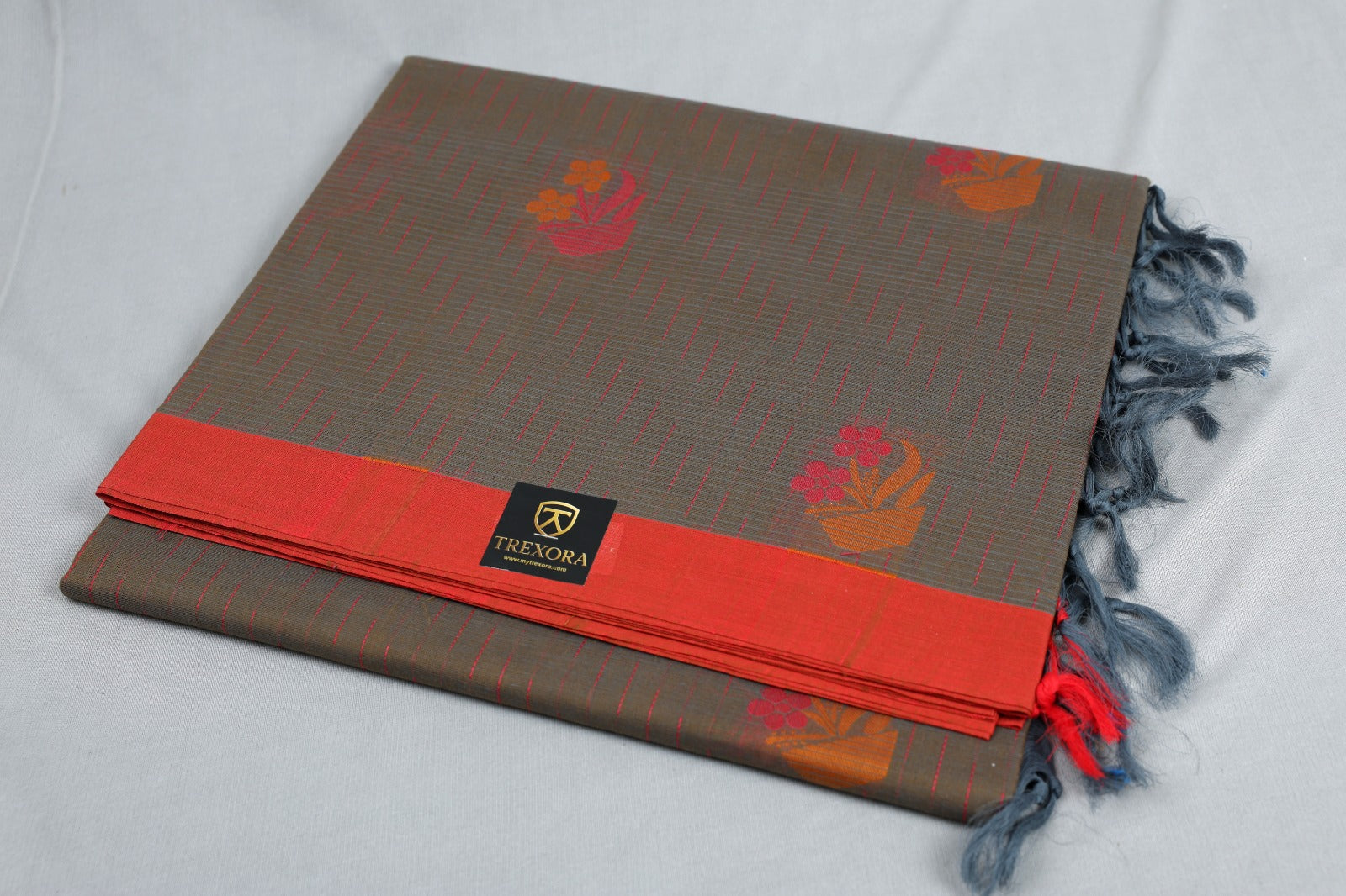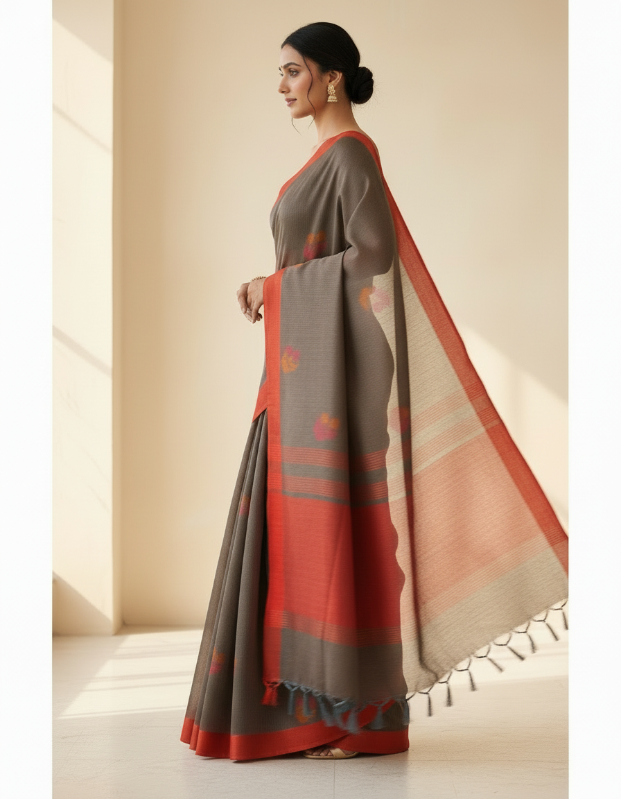 Pure Cotton Grey Floral Saree with Contrast Red Border & Tassels