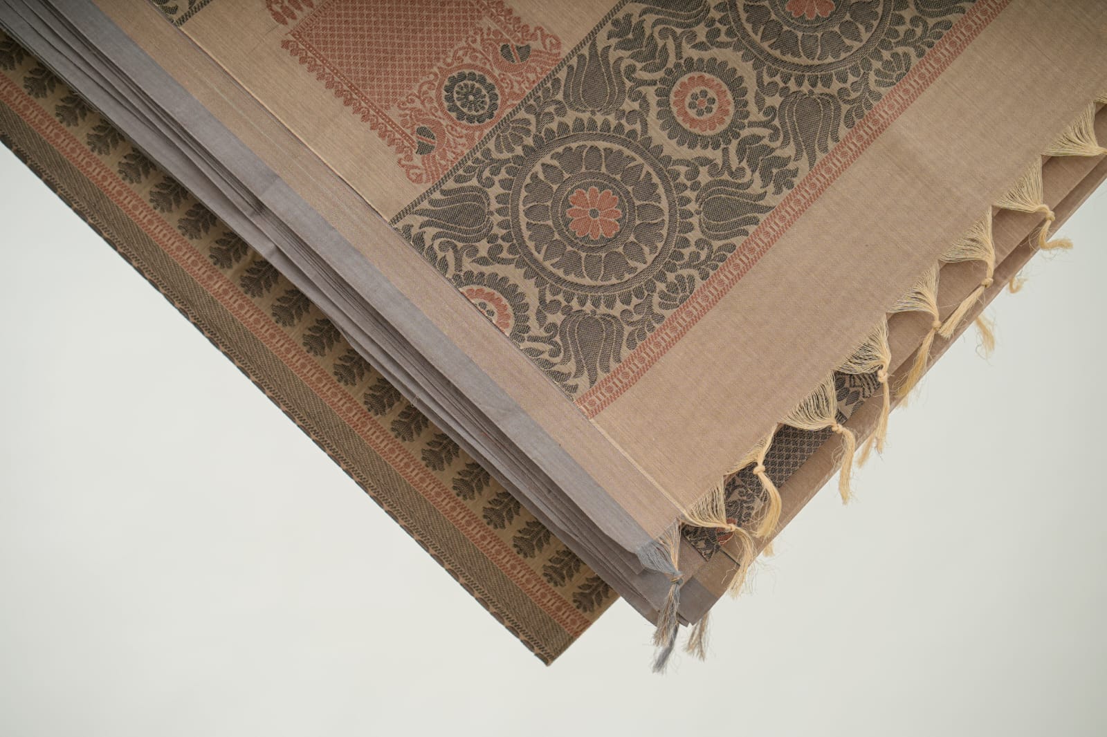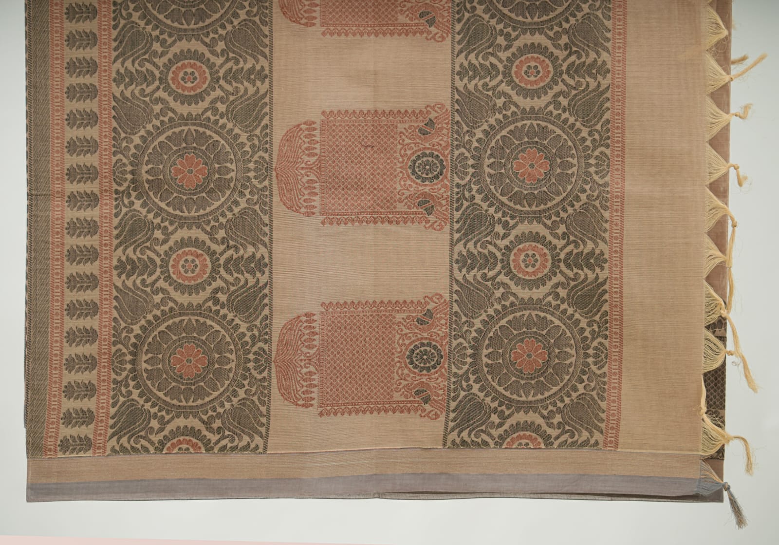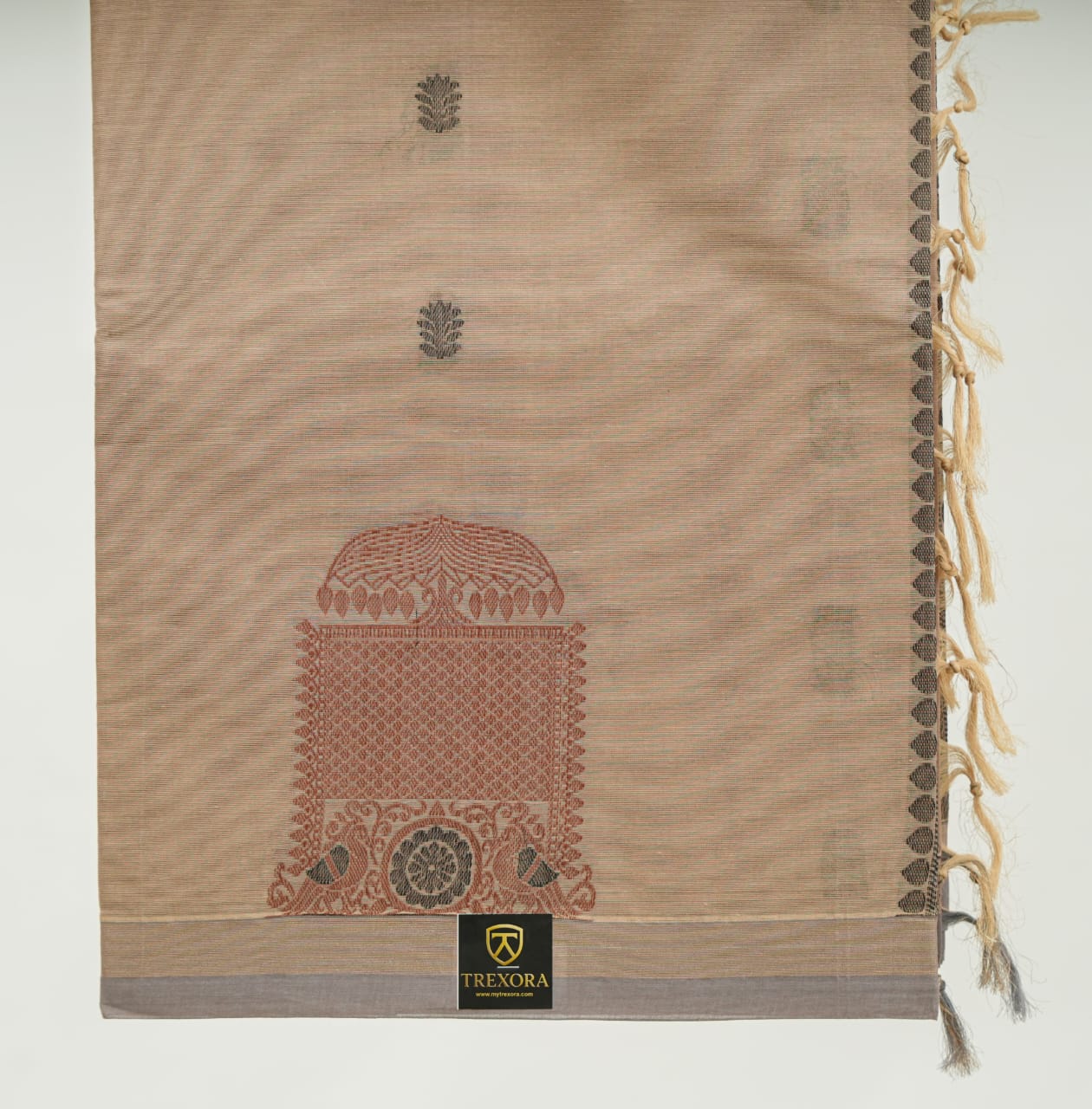 Pure Cotton Handloom Saree – Beige Body with Traditional Temple Motif & Subtle Grey Border | Trexora