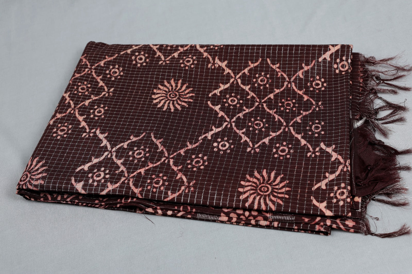 This stylish pure cotton maroon saree features a beautiful batik-style floral and geometric print set over a subtle checkered weave, giving it a rich, handcrafted look while still being 100% cotton (not handloom). The contrasting floral pallu and soft tassel edges add extra charm, making it perfect for everyday wear, office use, casual outings, and festive minimal styling. Lightweight, breathable, and effortlessly elegant, this TREXORA saree brings together comfort and artistry in one timeless piece.