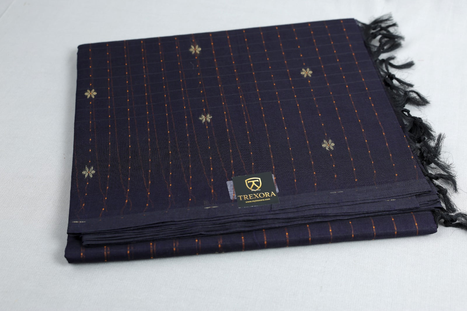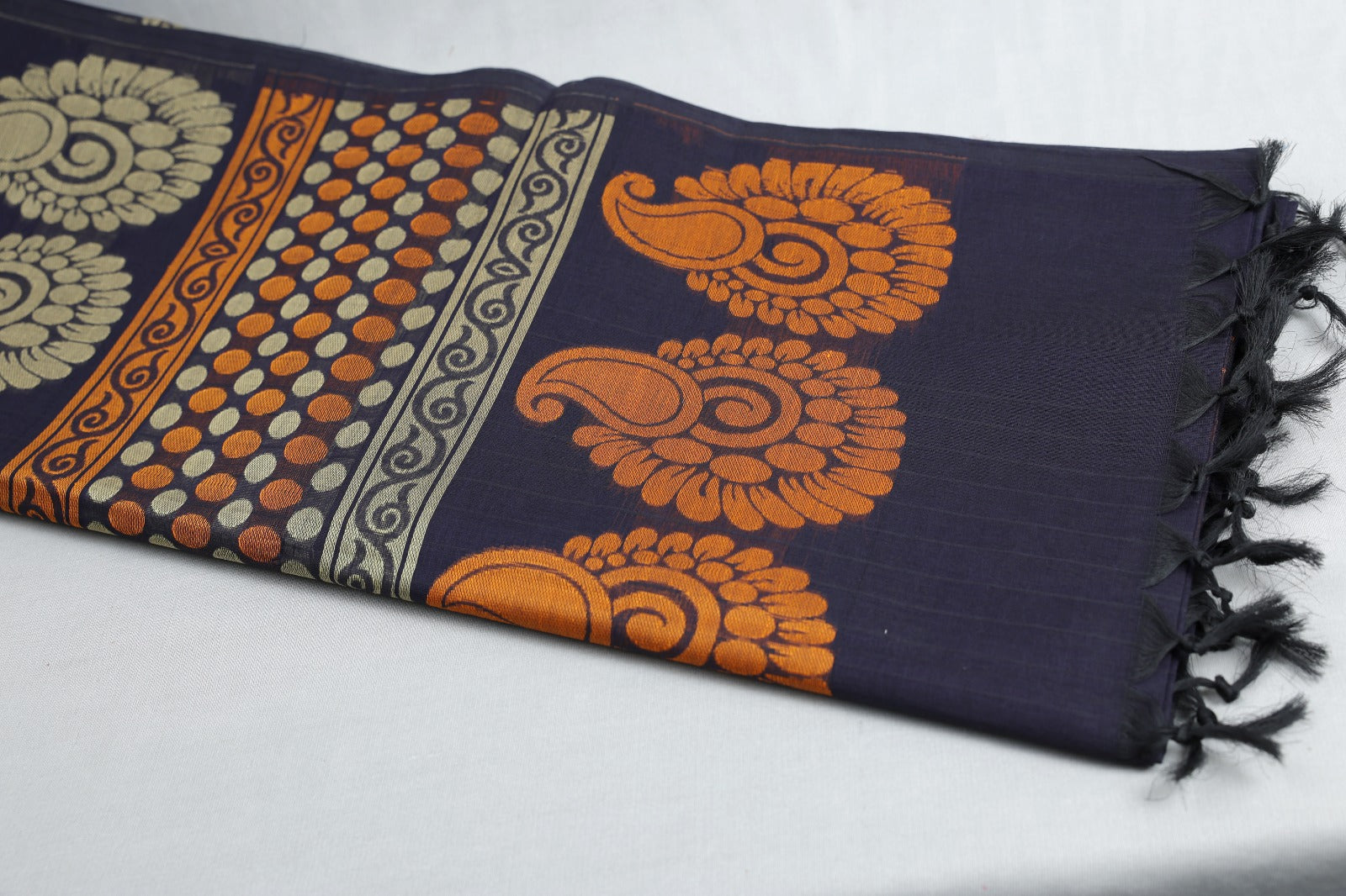 Pure Cotton Navy Blue Saree with Golden & Orange Paisley Design | TREXORA Soft Daily Wear Saree